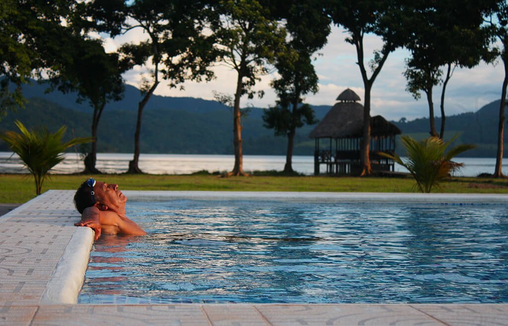 papá relajado en la piscina
